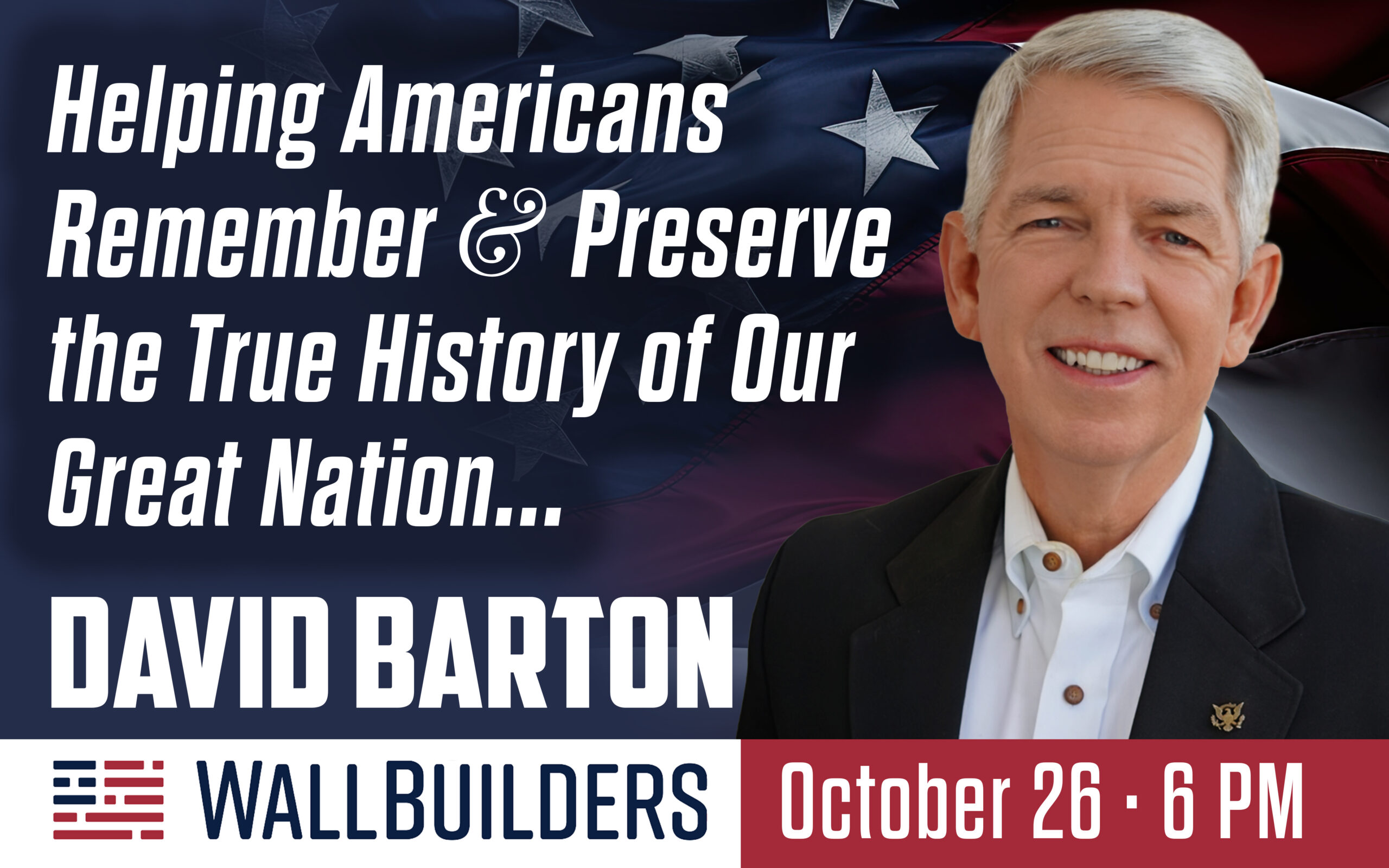 Join us on Sunday, October 26th at 6:00 PM as we welcome David Barton, founder of WallBuilders and one of America’s foremost historians on faith and freedom. Known for his engaging presentations and deep knowledge of America’s spiritual and historical roots, David will challenge and encourage us with insights on how biblical principles have shaped our nation and continue to impact our lives today.